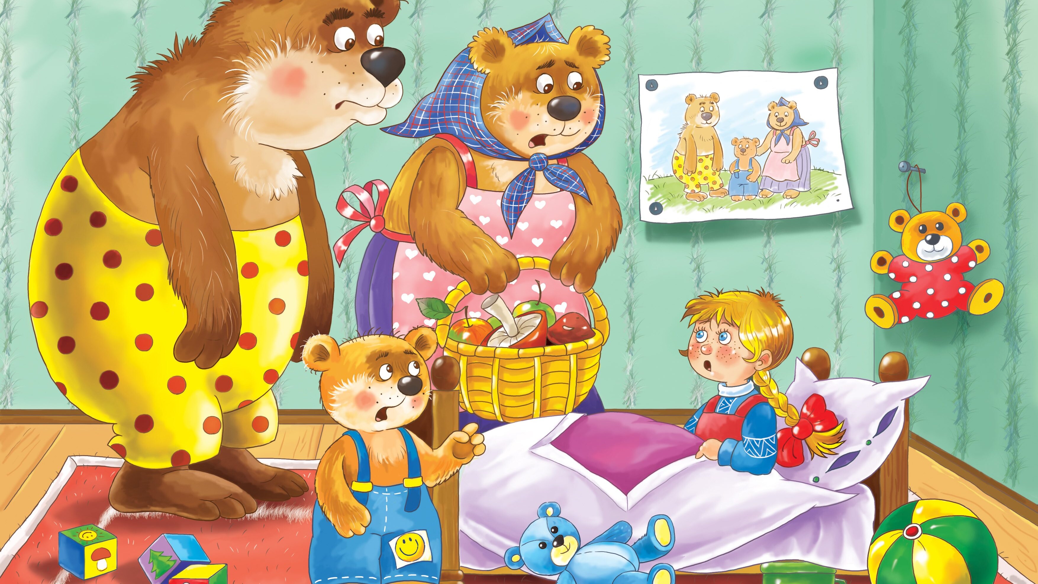 Al rientro la famiglia di orsi si accorse delle marachelle di Riccioli d'oro e orsetto scoppiò a piangere vedendo la sua zuppa finita e la sua sedia rotta. Andarono in camera da letto dove la piccola dormiva beata. La svegliarono e Riccioli d'oro si spaventò molto, chiese scusa e scappò via.